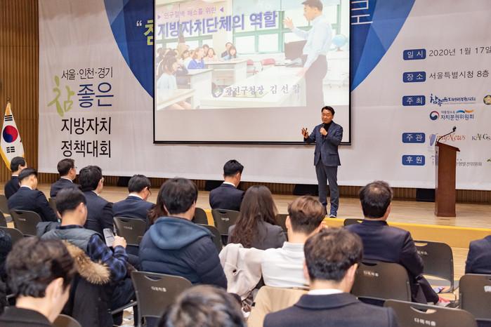 김선갑 광진구청장이 지난 17일 서울시청 다목적홀에서 열린 ‘참좋은 지방자치 정책대회’에 참좋은 정책 발표자로 참여했다. 사진은 김 구청장이 ‘인구절벽 해소를 위한 지방자치단체의 역할’을 주제로 발표하고 있는 모습. (사진제공=광진구청)