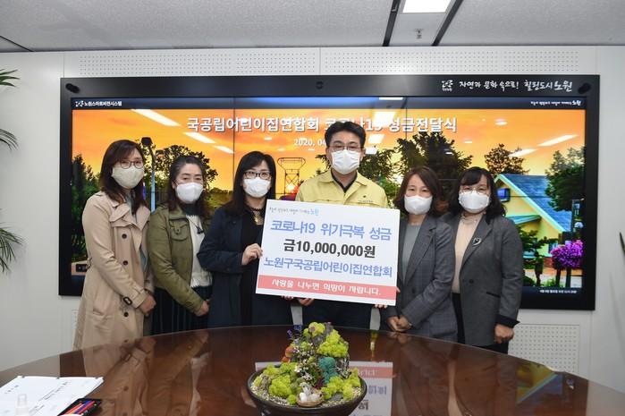 노원구는 6일 구청장실에서 국공립어린이집연합회와 ‘코로나19 위기 극복 성금 전달식’을 개최, 국공립어린이집연합회로부터 성금 1000만원을 전달받았다. 사진은 오승록 구청장(오른쪽에서 세 번째)과 관계자들이 기념촬영을 하는 모습. (사진제공=노원구청)