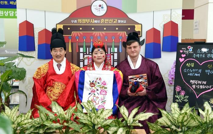 경기 의정부시가 코로나19 장기화로 잠시 중단했던 '시장님과 함께 하는 혼인신고 기념 포토존 인증샷 이벤트'를 최근부터 재개했다. 사진은 이날 인증샷 이벤트에 참여한 다문화 가정이 안병용 시장(왼쪽)과 함께 포토존에서 기념촬영을 하는 모습. (사진제공=의정부시청)