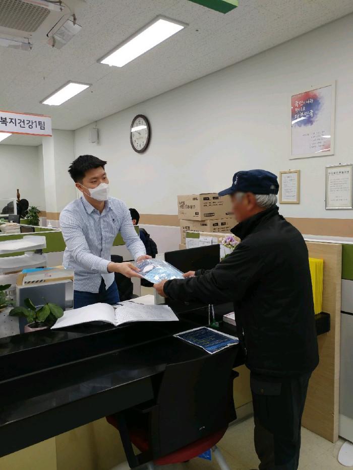 구로구가 최근 지역내 경제적인 어려움을 겪는 생활취약계층에 1인당 3매씩 마스크 5만개를 긴급 배부했다. 사진은 마스크를 전달받고 있는 한 주민의 모습. (사진제공=구로구청)