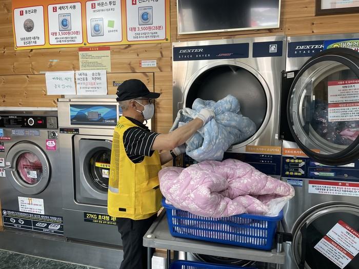 인천 강화군 자원봉사센터는 최근 '찾아가는 이불세탁 봉사의 날' 2차 활동을 마무리했다. 이불세탁 봉사는 거동이 불편해 이불세탁이 어려운 홀몸노인 등을 대상으로 연 3~4회 방문해 이불을 수거해 세탁·건조해 비대면으로 전달한다. 사진은 봉사자들이 이불세탁 봉사를 하고 있는 모습. (사진제공=강화군청)