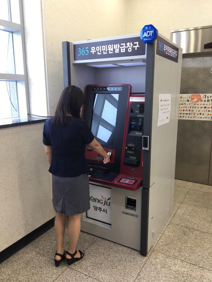 경기 양주시는 5일 장흥농협 송추지점에 365일 운영하는 무인민원발급기를 설치하고 운영을 시작했다. 무인민원발급기는 주민등록등초본 등 89종의 증명서를 지문 인식을 통해 최대 50% 감면된 수수료로 발급받을 수 있다. 사진은 한 여성이 무인민원발급기를 이용하고 있는 모습. (사진제공=양주시청)