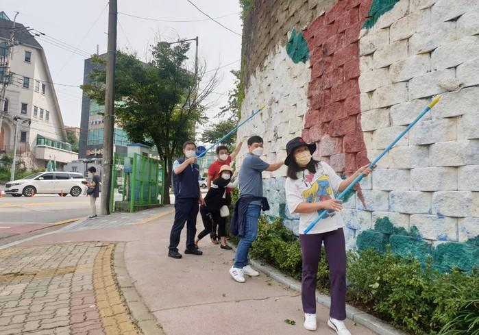 경기 수원시 장안구 조원1동은 최근 지역내 ‘수성초등학교 외벽 벽화보수’ 작업을 시작했으며, 이달 말부터 조원고등학교 미술부 학생들이 자연풍경 그림을 그릴 예정이다. 사진은 마을만들기협의회 위원들은 퇴색된 벽화를 깨끗이 지우는 벽면정비 작업을 하고 있는 모습. (사진제공=장안구청)