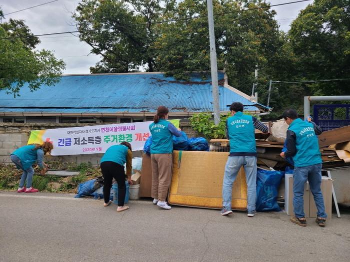 경기 연천군 신서면지역사회보장협의체는 대한적십자어울림봉사회와 연계해 최근 신서면 도신3리에 거주하는 저소득 취약계층 가정에 주거환경 개선사업을 실시했다. 사진은 이날 봉사자들이 집안 도배·싱크대 교체 후 쓰레기를 치우고 있는 모습. (사진제공=연천군청)