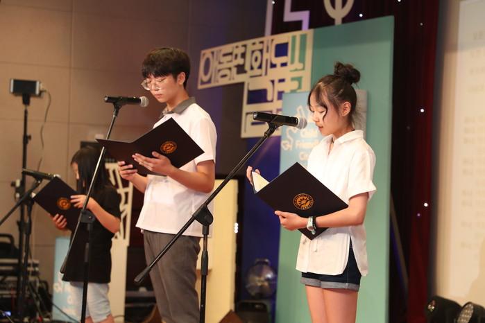 서울 금천구는 최근 구청 12층 대강당에서 '유니세프 아동친화도시 인증 선포식'을 개최했다. '유니세프 아동친화도시'는 유엔아동권리협약을 준수함으로써 불평등과 차별을 없애고 18세 미만 모든 아동의 권리를 보장하는 지역사회를 말한다. 사진은 선포식에 참여한 아동의회 의원들이 아동권리헌장을 낭독하고 있는 모습. (사진제공=금천구청)