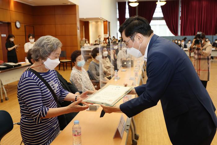 도봉구가 16일 구청 자운봉홀에서 '2021년도 제2분기 모범구민 표창 수여식'을 진행했다. 사진은 표창 수여식에 참석한 이동진 구청장(오른쪽)이 모범구민에게 표창장을 전달하고 있는 모습. (사진제공=도봉구청)