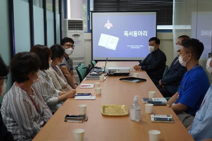 경기 부천도시공사가 최근 직장내 독서문화 정착을 위해 독서동아리 ‘안다미로’ 발대식을 열었다. 사진은 독서동아리 회원들이 이야기를 하고 있는 모습. (사진제공=부천도시공사)