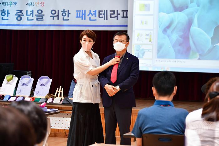 서울 중랑구는 최근 ‘우아한 중년을 위한 패션테라피’ 수업을 진행했다. 패션테라피 수업은 코로나19로 우울감 등을 느끼는 주민들이 스스로 모습을 변화시켜 자신감과 활기를 되찾도록 기획한 평생학습 교육 프로그램이다. 사진은 수업에서 류경기 구청장(오른쪽)이 실습대상자로 나선 모습. (사진제공=중랑구청)