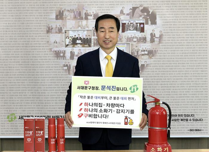 문석진 서울 서대문구청장이 14일 각 가정과 차량에 소화기 설치를 권장하는 ‘119 릴레이 챌린지’에 동참했다. ‘119’는 ‘하나(1)의 집과 차량마다 하나(1)의 소화기와 화재감지기를 구비(9)하자’란 의미를 지닌다. 사진은 문 구청장이 119 릴레이 챌린지에 참여하고 있는 모습. (사진제공=서대문구청)