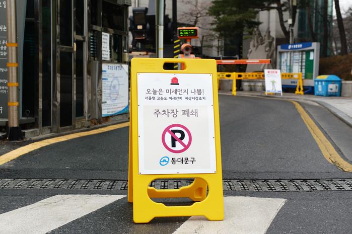 | ▲ ‘미세먼지 비상저감조치’에 따라 폐쇄된 동대문구청 주차장 입구. (사진제공=동대문구청) |
