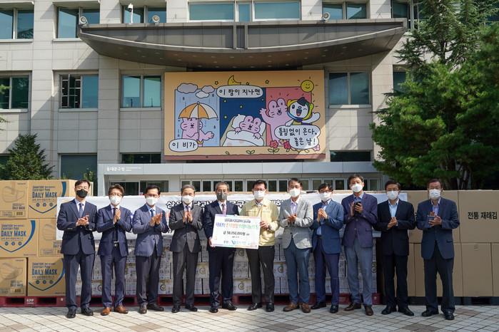 서울 동대문구는 최근 삼육재단과 ‘추석명절 희망나눔의 장’ 후원 물품 전달식을 개최했다. 이날 삼육재단은 지역내 생활이 어려운 이웃들을 위해 구에 김선물세트 1350상자, 삼유두유 1350상자, 삼육마스크 1350상자 등(환가액 5805만원 상당)을 전달했다. 사진은 전달식에서 유덕열 구청장(가운데)과 관계자들이 기념촬영을 하는 모습. (사진제공=동대문구청)