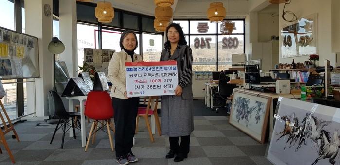 인천 중구 영종국제도시 미단시티에 위치한 갤러리84 인천한류마을은 코로나19 확산에 따라 지역사회 감염 예방을 위한 마스크 100장(35만원 상당)을 영종1동 행정복지센터에 기부했다. 사진은 마스크 기탁을 하며 함께 기념촬영을 하는 모습. (사진제공=인천 중구청)