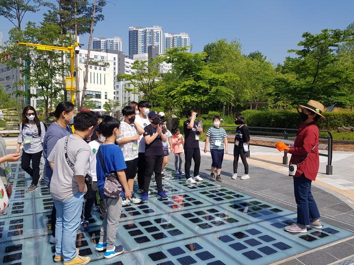 | ▲ 학생들이 능골근린공원 에너지마루에 전국 최초로 설치된 바닥태양광 발전시설을 체험하고 있다. (사진제공=강동구청) |
