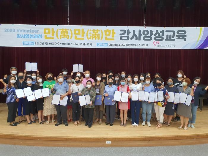 충남 아산시자원봉사센터는 아산시청소년교육문화센터에서 최근 총 나흘간 진행한 2020년 V(Volunteer)강사 양성과정을 성료했다. 사진은 수료식에서 참가자들이 기념촬영을 하는 모습. (사진제공=아산시청)