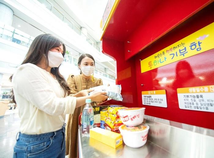 서울 용산구는 오는 18일까지 추석맞이 '기부나눔 통하나 캠페인'을 진행한다. 장기간 보관이 가능한 식품 및 생활용품을 구청 2·5층 로비에 설치된 기부함에 넣으면 어려운 이웃들에게 명절선물로 전달된다. 사진은 지난 7일 주민들이 통하나 기부함에 식품을 기부하고 있는 모습. (사진제공=용산구청)