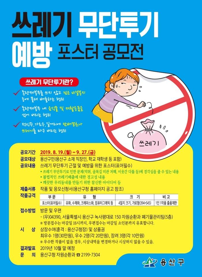 서울 용산구(구청장 성장현)가 오는 9월27일까지 깨끗한 주거환경 조성을 위해 '쓰레기 무단투기 예방 포스터'를 공모한다.
