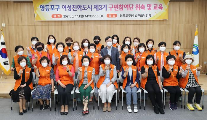 영등포구 ‘제3기 구민참여단’이 14일 위촉식을 시작으로 본격적인 활동에 돌입했다. 구민참여단은 오는 2023년까지 여성친화도시 조성을 위한 지역 전문가로서, 주민 의견수렴, 모니터링 활동을 진행하며 여성친화적 지역문화 구축과 여성친화도시 조성에 힘쓸 방침이다. 사진은 채현일 구청장(둘째줄 가운데)과 참여단원들이 기념촬영을 하고 있는 모습. (사진제공=영등포구청)