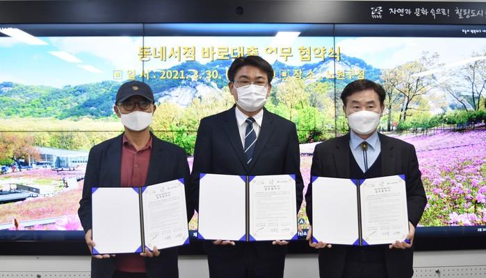 서울 노원구는 30일 ‘동네서점 바로 대출 서비스’ 업무협약을 체결했다. 협약을 통해 지역내 구립공공도서관 6곳은 시스템 구축관리와 희망도서 승인 등을, 지역서점 9곳은 승인도서 비치·도서대출반납처리 등을 맡아 협력한다. 사진은 협약식에서 오승록 구청장(가운데)이 관계자들과 기념촬영을 하는 모습. (사진제공=노원구청)