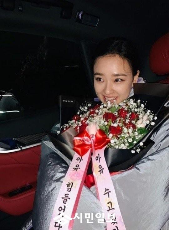 공개된 사진 속 손연재는 '아유 힘들었다, 아유 수고했다'라는 문구가 담긴 꽃다발을 들고 있다.