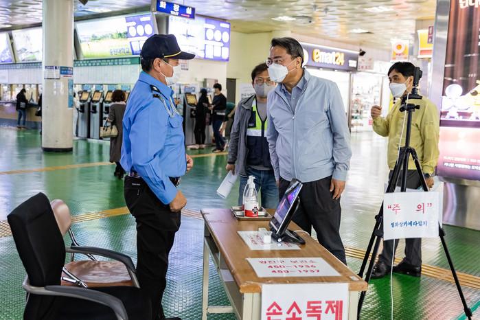 김선갑 서울 광진구청장이 지난 3일 추석연휴에도 코로나19로 연일 비상근무를 하고 있는 직원들을 찾아가 격려했다. 사진은 김 구청장(가운데)이 동서울터미널을 방문해 직원 및 관계자들과 이야기를 나누는 모습. (사진제공=광진구청)