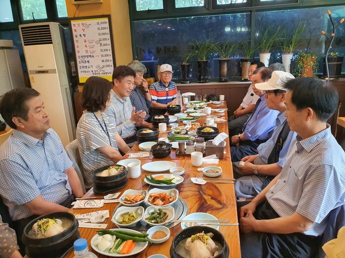 경기 수원시 권선구는 14일 초복을 맞아 지역내 음식점에서 (사)대한노인회 수원시 권선구지회에 삼계탕 등 보양식을 대접했다. 사진은 행사에 참석한 길영배 구청장이 노인들과 이야기를 나누고 있는 모습. (사진제공=권선구청)