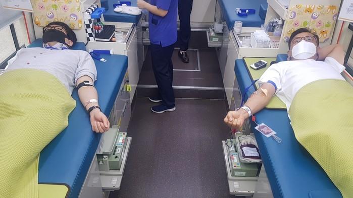 경기 안양도시공사 임직원들은 1일 코로나19 장기화에 따른 혈액 수급 부족상황 해소와 지역내 헌혈 참여 문화 확산을 위해 ‘사랑나눔 단체헌혈’ 행사에 동참했다. 사진은 헌혈버스에서 공사 직원들이 헌혈을 하고 있는 모습. (사진제공=안양시청)