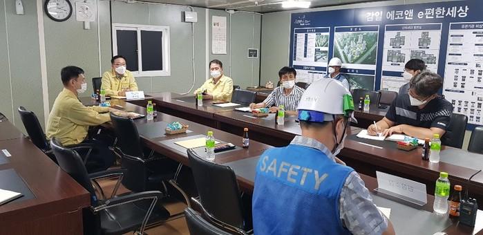 경기 하남시는 지난 5일 제10호 태풍 ‘하이선’ 북상을 대비해 지역내 위험지역 및 빗물 펌프장 등 피해우려지역을 현장 점검했다. 사진은 김남근 부시장(왼쪽 두 번째)이 감일지구 대형공사장을 방문해 현장 관계자들과 이야기를 나누고 있는 모습. (사진제공=하남시청)