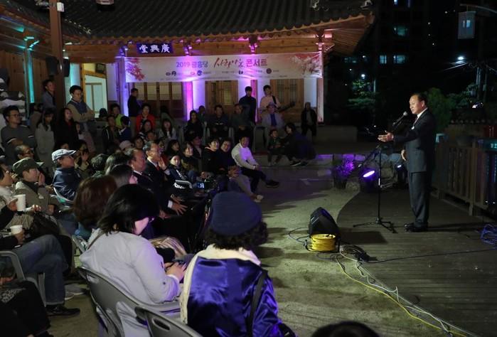 유동균 서울 마포구청장이 최근 마포 광흥당에서 열린 '광흥당 사랑나눔 콘서트'에 참석했다. 마포문화원이 주최하는 이날 콘서트에는 지역주민 등 약 100여명이 참석한 가운데 진행됐다. 사진은 유 구청장이 주민들에게 인사말을 전하는 모습. (사진제공=마포구청)