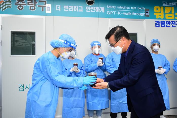 류경기 서울 중랑구청장이 16일 초복을 맞이해 구 코로나19 선별진료소를 방문해 근무자들에게 아이스커피를 전달하며 노고를 격려하고, 감염병 확산 방지를 위한 철저한 방역체계 유지를 당부했다. 사진은 류 구청장(오른쪽)이 근무자들에게 아이스커피를 건네고 있는 모습. (사진제공=중랑구청)
