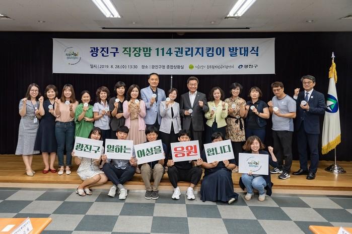 서울 광진구와 서울시 동부권직장맘지원센터가 28일 구청 종합상황실에서 ‘광진구 직장맘114권리지킴이’ 발대식을 했다. 광진구 직장맘114권리지킴이는 지역내 직장맘을 지원하는 9개 기관·단체 대표와 직장맘 대표 등 총 10명으로 구성됐다. 사진은 발대식에 참석한 김선갑 구청장 및 관계자들이 기념촬영을 하는 모습. (사진제공=광진구청)