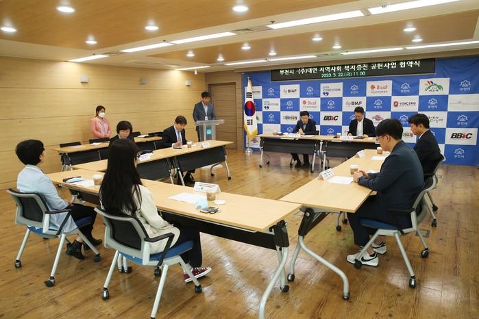 경기 부천시가 최근 시청에서 스포츠용품 유통업체 (주)대연과 저소득가정 아동 건강을 위한 지역사회 복지증진 공헌사업 협약을 체결하고, 앞으로 3년간 이들에게 스포츠 프로그램 및 스포츠 용품을 지원하기로 했다. 사진은 관계자들이 협약식을 진행하는 모습. (사진제공=부천시청)