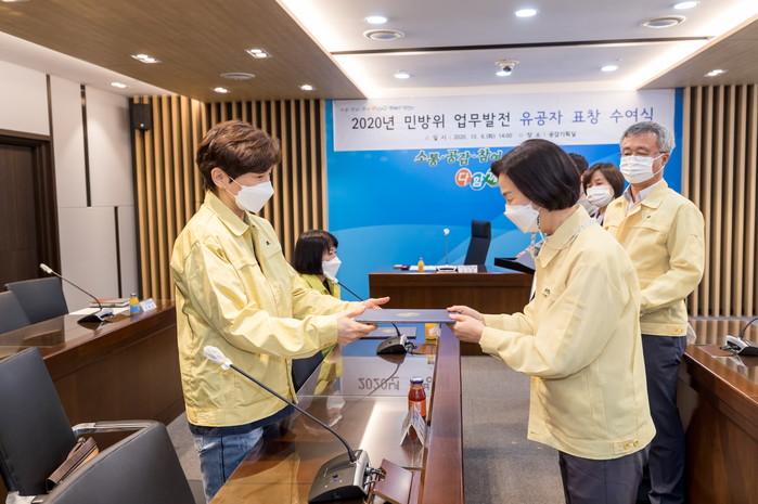 서울 양천구는 6일 '민방위대 창설 제45주년'을 맞이해 민방위 관계자의 사기를 진작하고 자긍심을 고취하기 위해 민방위 업무발전에 기여한 18명을 선정해 양천구청장 표창을 수여했다. 사진은 김수영 구청장(오른쪽)이 민방위 유공자에게 표창을 수여하고 있는 모습. (사진제공=양천구청)