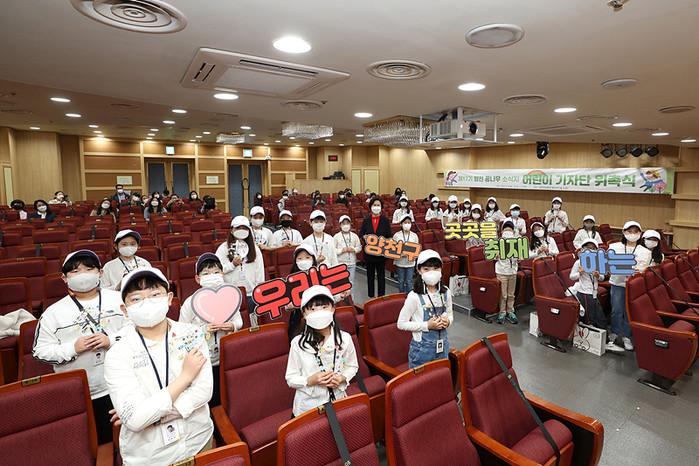양천구는 지난 4일 제17기 꿈나무소식지 어린이 기자단 위촉식을 진행했다. 31개 학교 3~6학년 69명으로 구성된 어린이 기자단은 오는 2022년 4월19일까지 활동하며, 꿈나무 소식지의 코너 선정부터 기사작성까지 직접 참여하게 된다. 사진은 양천 꿈나무 기자단 위촉식이 진행되는 모습. (사진제공=양천구청)