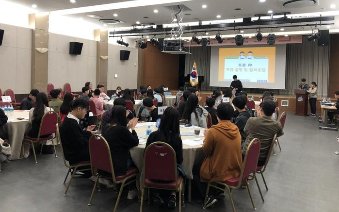 서울 성북구가 최근 구청 아트홀에서 '2020년도 아동청소년 참여예산 선정을 위한 열린토론회'를 개최했다. 이날 토론회는 구 어린이·청소년참여기구 구성원 및 지역내 아동·청소년 50여명이 참여한 가운데 진행됐다. 사진은 회의 진행 모습. (사진제공=성북구청)