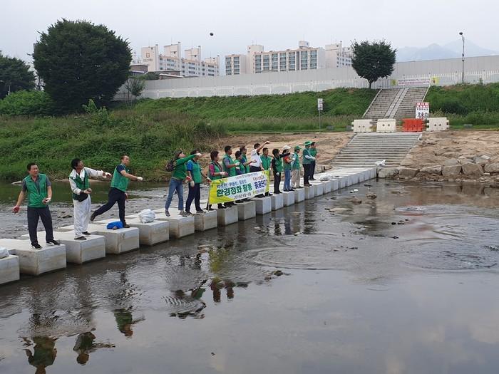 경기 의정부시 신곡1동 새마을지도자협의회와 새마을부녀회는 최근 청룡초등학교 주변 및 장곡로 인도변과 중랑천의 환경정화 활동을 실시했다. 이날 신곡1동 새마을지도자협의회·새마을부녀회·공무원 등 30여명은 함께 인도변의 잡초를 제거하고 중랑천에서 유용미생물(EM) 흙공 600여개를 투척했다. 사진은 참여자들이 EM 흙공을 던지고 있는 모습. (사진제공=의정부시청)