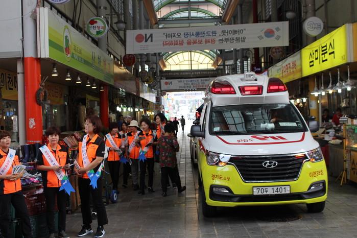 경기 이천소방서는 최근 관고전통시장에서 소방대원과 유관기관, 의소대, 시장상인회 등 약 80여명이 참석한 가운데 소방통로 확보 훈련 및 캠페인을 실시했다. 사진은 참여자들이 캠페인을 진행하는 모습. (사진제공=이천소방서)