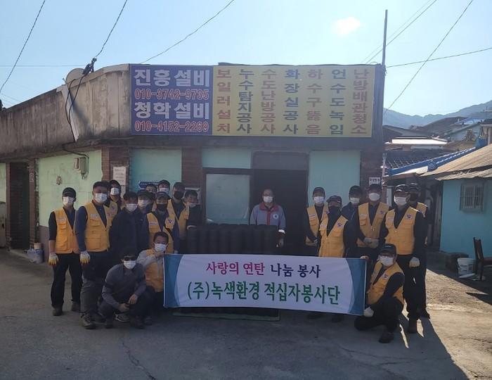 경기 의정부시 송산1동 (주)녹색환경은 최근 다가오는 겨울을 대비해 연탄 2000장을 기부, 빼벌마을에 거주하는 홀몸노인 4가구에 직접 배달했다. 사진은 (주)녹색환경 직원들이 기념촬영을 하는 모습. (사진제공=의정부시청)