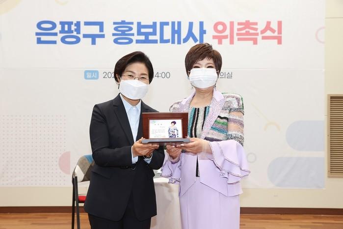 서울 은평구는 지난 12일 대표 트로트 가수 김연자씨를 홍보대사로 위촉했다. 은평구민인 김씨는 이번 홍보대사 위촉을 계기로 앞으로 구 홍보와 행사 참여 등 다양한 활동을 이어나갈 예정이다. 사진은 위촉식에서 김미경 구청장(왼쪽)과 김씨가 기념촬영을 하는 모습. (사진제공=은평구청)
