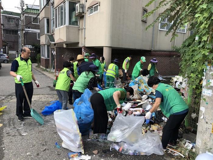 경기 수원시 권선구 세류3동 행정복지센터는 최근 동 단체원 및 주민 30여명이 참여한 가운데 '추석맞이 일제대청소'를 실시했다. 사진은 참여자들이 쓰레기를 수거하고 있는 모습. (사진제공=권선구청)