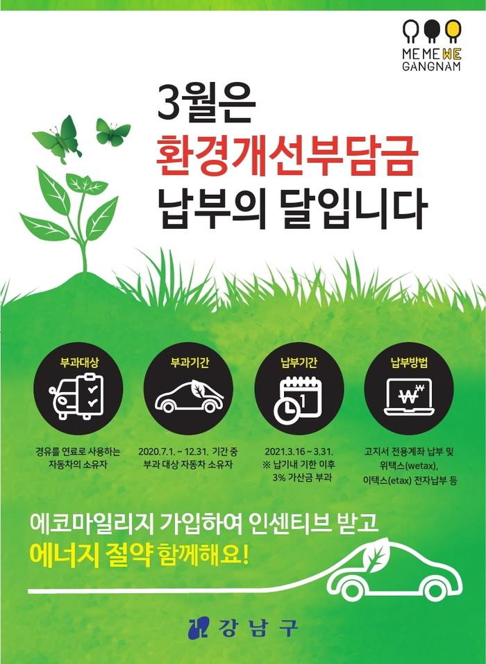 [시민일보 = 이대우 기자] 서울 강남구(구청장 정순균)가 이달 지역내 경유 차량 9984대 운행자를 대상으로 올해 1기분 자동차 환경개선부담금 9억8000만원을 부과한다.