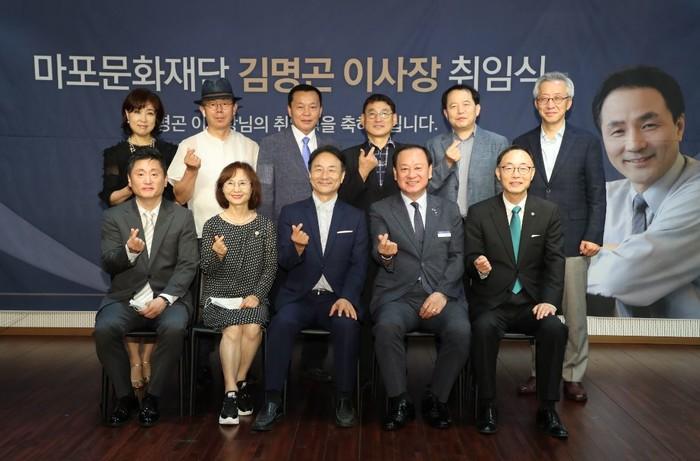 유동균 서울 마포구청장이 최근 마포아트센터에서 열린 마포문화재단 김명곤 신임 이사장 취임식에 참석해 축하 인사와 함께 구민을 위한 풍부한 문화콘텐츠 제공을 당부했다. 사진은 유 구청장(앞줄 오른쪽 두 번째)이 김 신임 이사장 및 관계자들과 기념촬영을 하는 모습. (사진제공=마포구청)