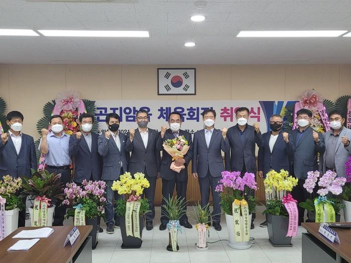 경기 광주시 곤지암읍은 최근 체육회장 취임식을 개최해 박두순 곤지암읍 이장협의회장이 곤지암읍 체육회장으로 취임했다. 이번 곤지암읍 체육회장 취임은 체육회 당연회장이 곤지암읍장에서 곤지암읍 이장협의회장으로 변경돼 이뤄졌다. 사진은 취임식에서 관계자들이 기념촬영을 하는 모습. (사진제공=광주시청)