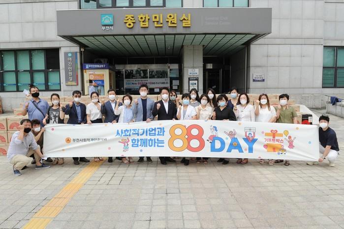 경기 부천사회적기업협의회는 최근 시청 민원실 앞에서 '부천사회적기업과 함께하는 88Day!'를 개최했다. 이날 부천시내 지역아동센터를 이용하는 어린이·청소년·센터 종사자들에게 각 3만원 상당의 기프트 박스를 선물했다. 사진은 행사에 참여한 장덕천 시장(가운데)과 관계자들이 기념촬영을 하는 모습. (사진제공=부천시청)