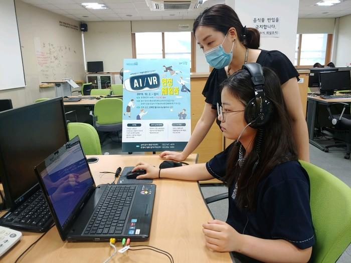 서울 송파구는 최근 언택트 채용 확산에 따른 청년층 구직 지원을 위해 '찾아가는 AI 면접 체험관'을 운영했다. 체험관은 공공기관 및 금융권에 취업을 희망하는 일신여상 3학년 학생들을 대상으로 학교 기업연습실에서 AI 모의면접을 하는 방식으로 진행했다. 사진은 AI 면접 체험을 하는 학생의 모습. (사진제공=송파구청)