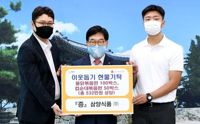 경기 광주시는 8일 삼양식품(주) 성남지점으로부터 코로나19 취약계층 지원의 일환으로 라면 150상자(532만원 상당)를 기탁받았다. 사진 기탁식에서 신동헌 시장(가운데)과 관계자들이 기념촬영을 하고 있는 모습. (사진제공=광주시청)