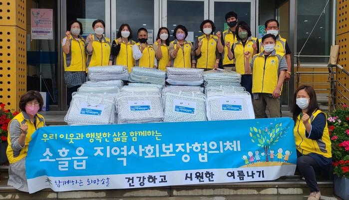 경기 포천시 소흘읍 지역사회보장협의체는 지난 24일 ‘2020년 건강하고 시원한 여름나기 지원사업’을 진행했다. 이날 협의체 위원들은 저소득 취약계층 40가구를 방문해 안부확인 및 폭염예방 안전수칙을 안내하고, 시원한 여름을 보낼 수 있도록 여름이불 세트를 전달했다. 사진은 위원들이 기념촬영을 하는 모습. (사진제공=포천시청)