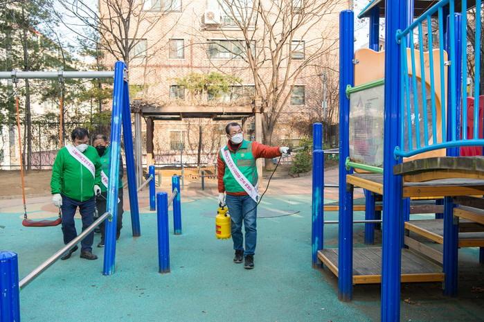 양천구 신정4동 민관합동 방역봉사단체인 ‘마을사랑방역봉사단은’ 3일 코로나19 확산 방지를 위해 신정역을 비롯해 어린이 놀이터, 공원 등 지역내 다중이용시설을 대상으로 방역을 했다. 사진은 놀이터에서 소독작업을 하는 모습. (사진제공=양천구청)