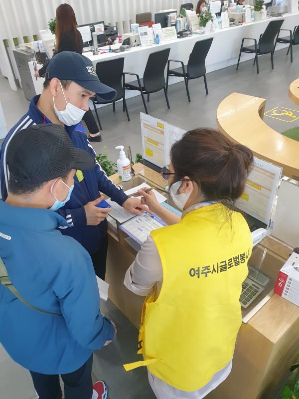 경기 여주시 글로벌봉사단이 최근 시청 행복민원실에서 결혼이민자, 영주권자 등을 대상으로 재난기본소득 신청 안내 통역봉사를 했다. 이번 봉사는 베트남, 중국 등의 대표들이 참여해 신청서 작성, 선불카드 사용 안내 등을 본국어로 통역했다. 사진은 단원들이 신청서 작성을 돕는 모습. (사진제공=여주시청)