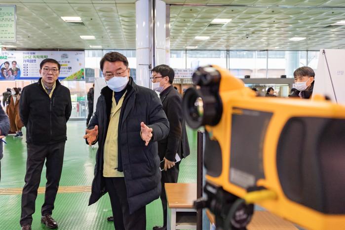 최근 김선갑 서울 광진구청장은 신종 코로나바이러스 감염 예방이 더욱 중요해짐에 따라 24시간 비상체계에 고생한 현장 근무자들을 격려하고 매뉴얼이 잘 지켜지고 있는지 확인하기 위해 현장점검에 나섰다. 사진은 유동인구가 많은 동서울터미널을 찾아 신종 코로나 바이러스 대응 현장점검을 하는 김 구청장의 모습. (사진제공=광진구청)