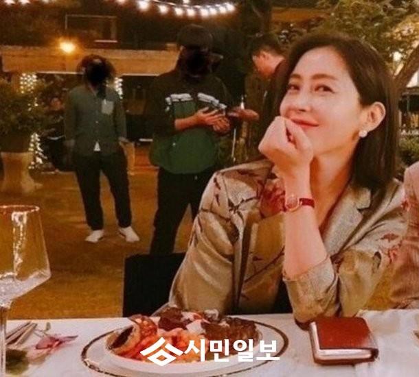 사진 속 송윤아는 음식과 와인을 곁들이고 있는 모습. 우아한 표정은 물론 자연스러운 모습이 아름다움을 더욱 돋보이게 한다.